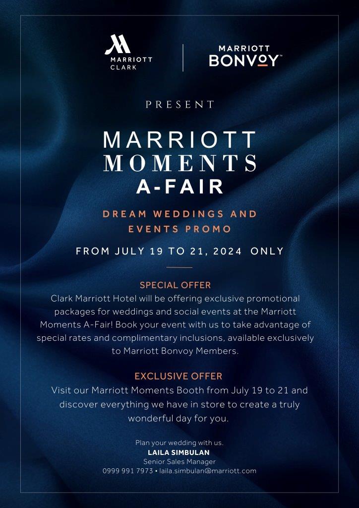 Catch Clark Marriott in the 3 -day upscale and exraordinary bridal fair on July 19 to 21 at the MGBX Marriott Grand Ballroom.