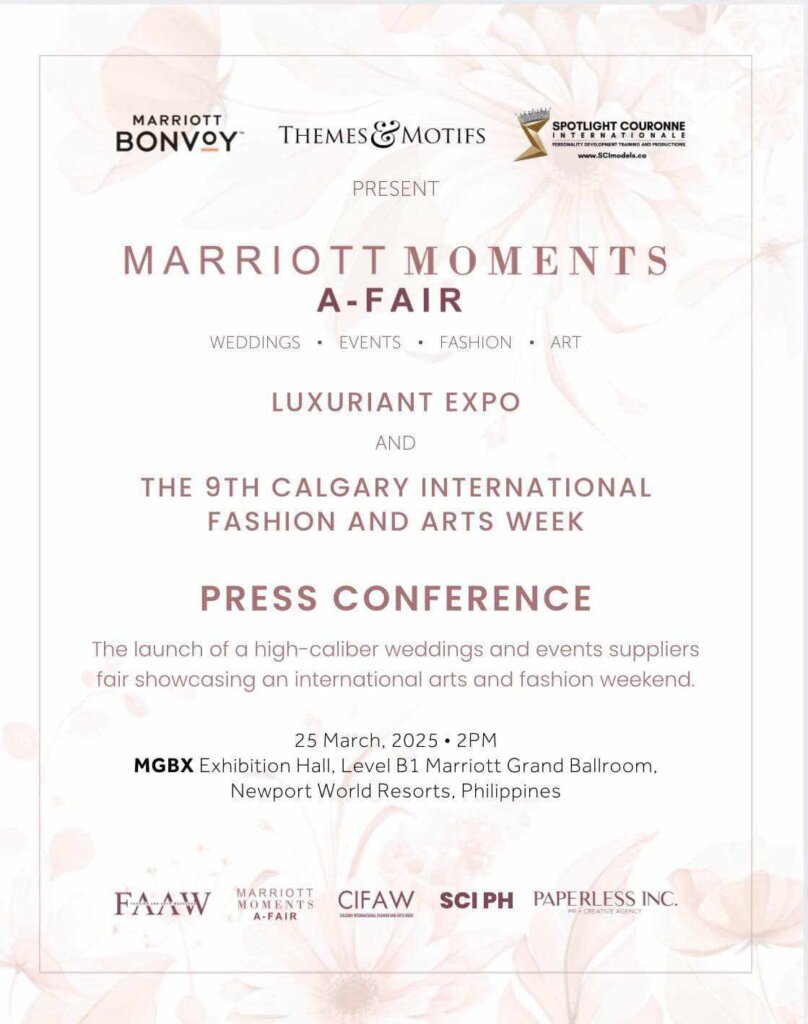 World renowned fashion event in Canada, New York and Paris makes its way to the Philippines with “The 9th Calgary International Fashion and Arts Week” also known as CIFAW, which is all set to launch a first in the Philippines – “The Fashion Weekend”, a new major component of the annual and now calibrated “Marriott Moments A-Fair”, now dubbed, “MARRIOTT MOMENTS A-FAIR”: (Weddings, Events, Fashion, Arts) LUXURIANT EXPO.