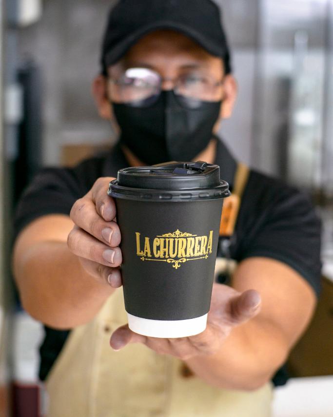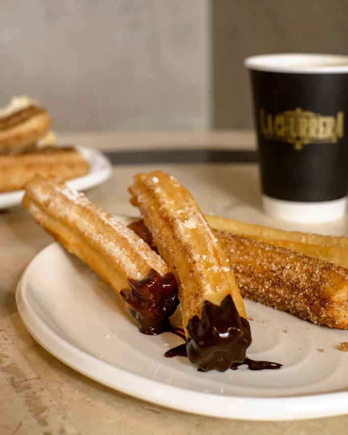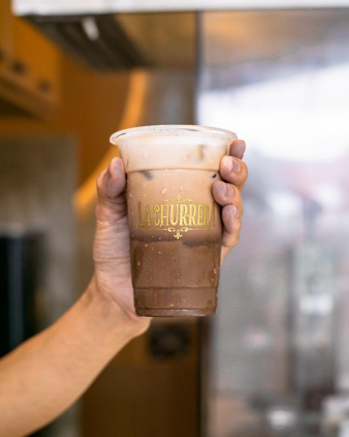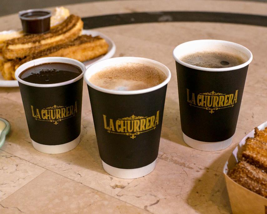 At La Churrera, churros are typically paired with several coffee drinks such as Americano, cappuccino, latte, Spanish latte, and iced coffee, along with hot chocolate and other beverages.